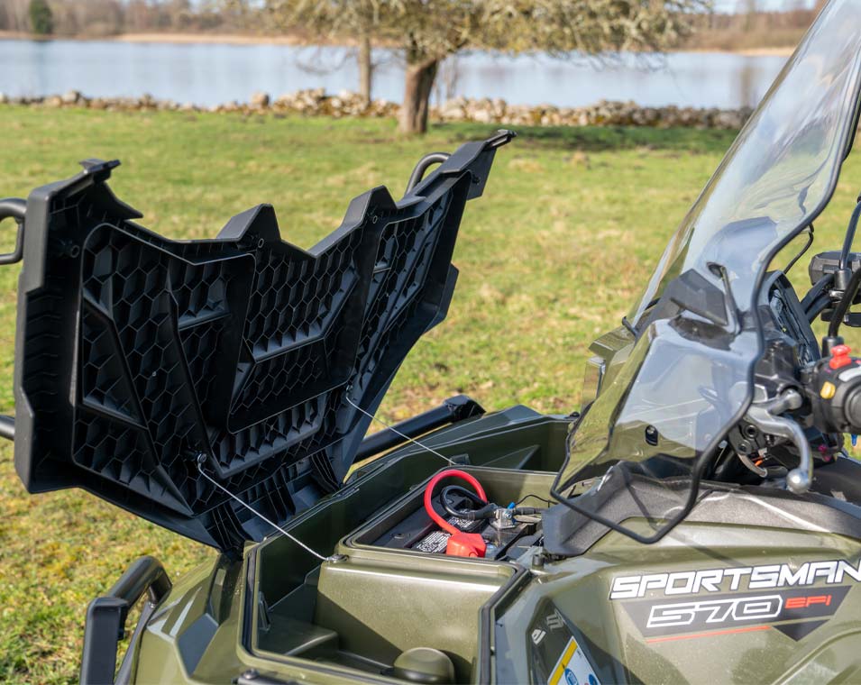 - Prise électrique 12 volts, port de charge lente intégré, pré-câblé pour chauffe-mains et chauffe-pouces, système de sécurité activé par code PIN, Protections avant et arrière des bras triangulaires, rallonge de porte-bagages avant, rails métalliques pour benne